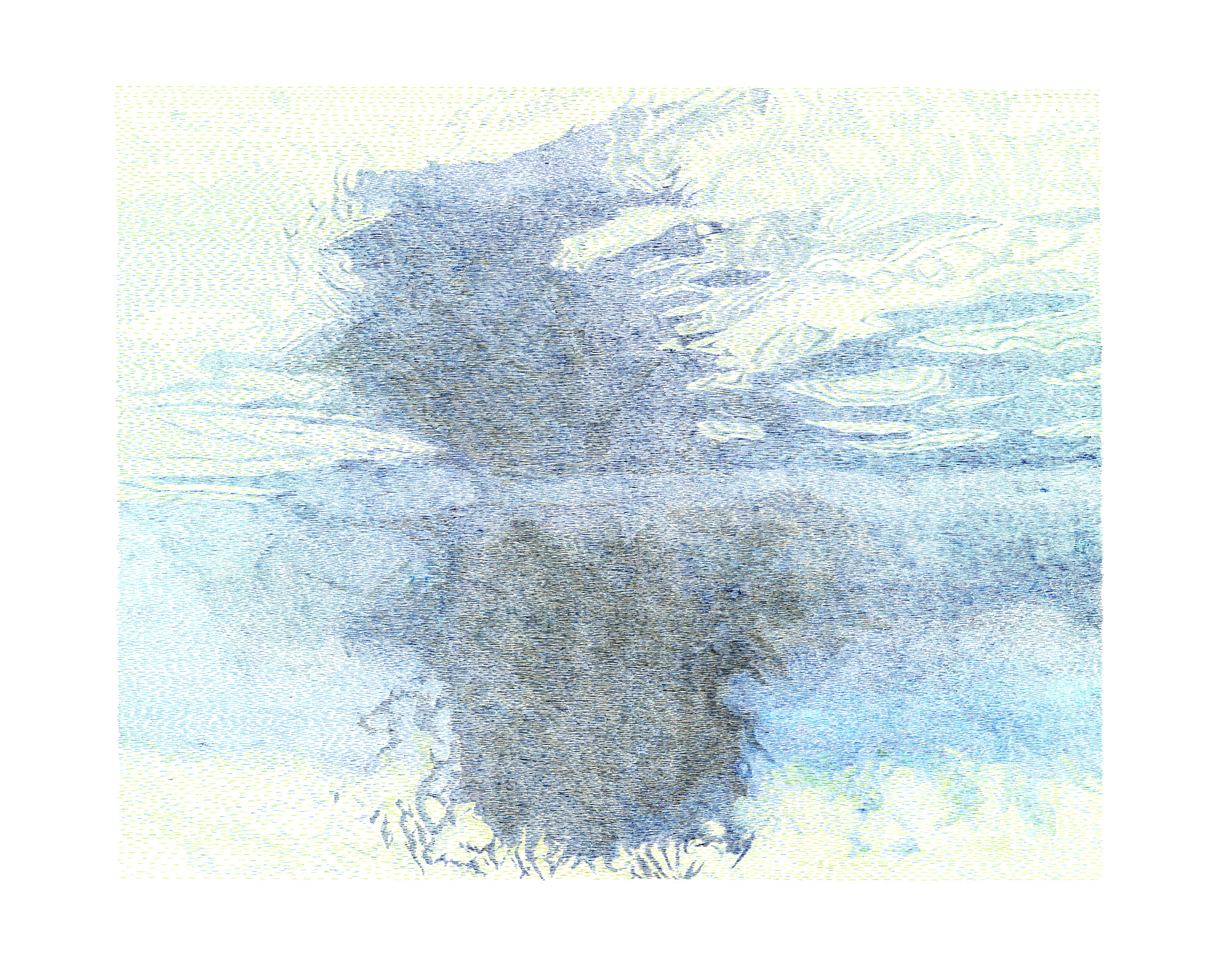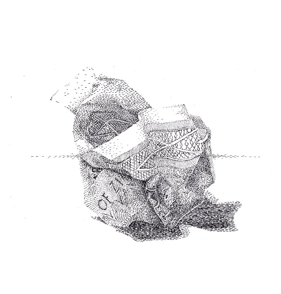 Included in this project is a series of large format drawings depicting other oceanic trauma, such as ghost nets and plastic islands. Working from photographs of these environmental dangers, I have translated the pixels that build the images into lines drawn by a quill. Much like my data-driven works, I have taken the place of an interpretive technology as an intervention and process of understanding. This process in turn has created a play on the optics in the image which dissolves when viewed from a close distance. My aim is to ask the viewer to find the optimum perspective to “focus” the image, allowing the viewer to make their own assignment through their physical proximity.