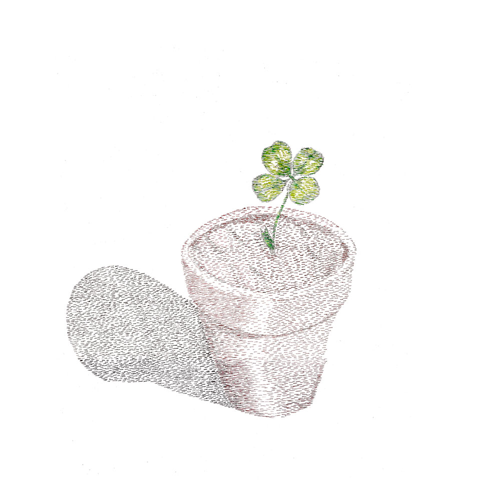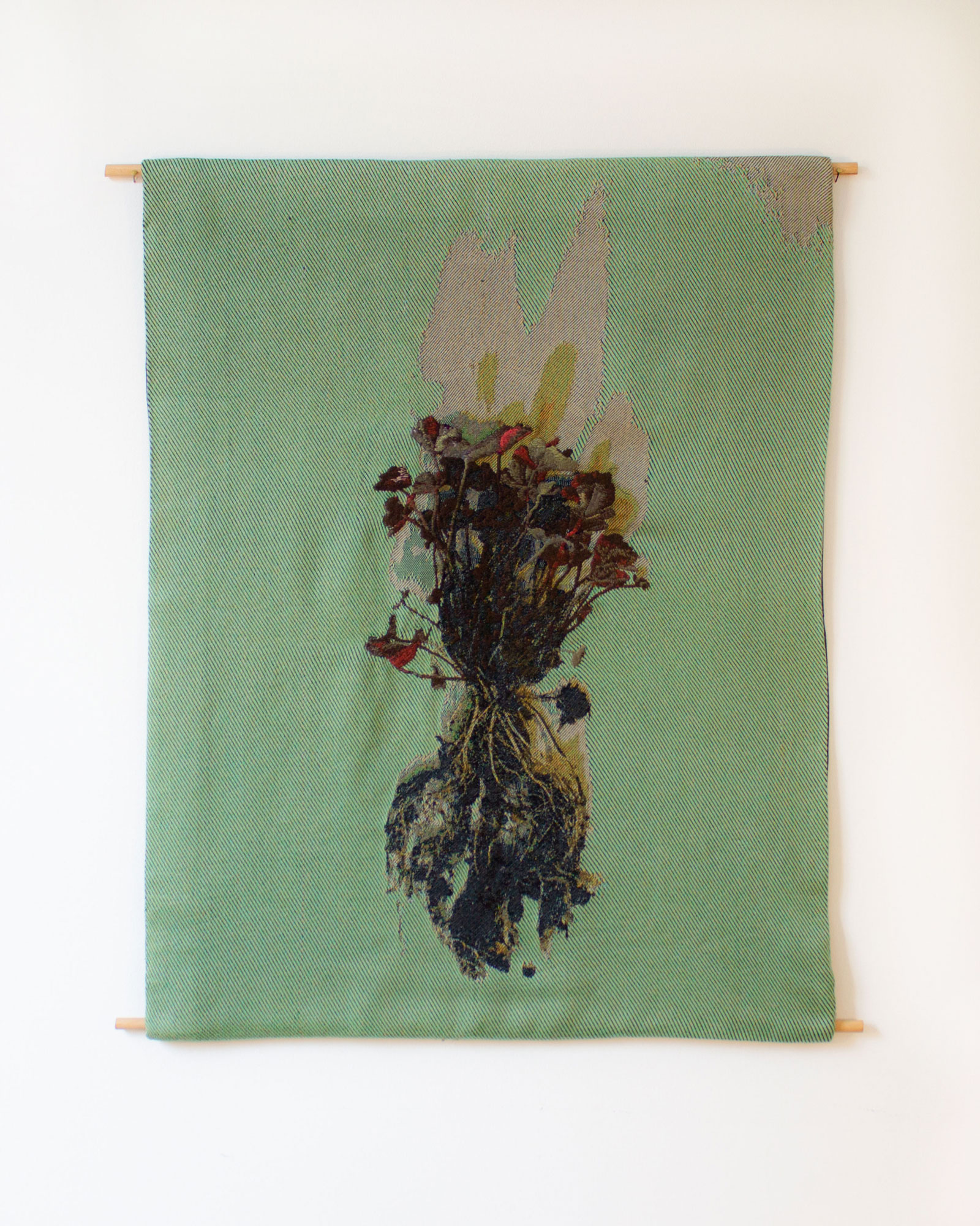 The chances of finding a four-leaf clover was about 1 in 10,000, until in 2010 when the University of Georgia in Athens and Samuel Roberts Noble foundation in Ardmore, Oklahoma, believed they found the four-leaf gene and made the plant available on the commercial market. In 2018 I purchased three of these plants from a local plant market in Montreal. I washed the plant to expose its roots and photographed the specimens. The image of these plants with their roots exposed was then rendered into a jacquard. I then manually embroidered the plant’s leaves back to their original appearance as a way to highlight how meaning can be lost through a photograph or digital representation.